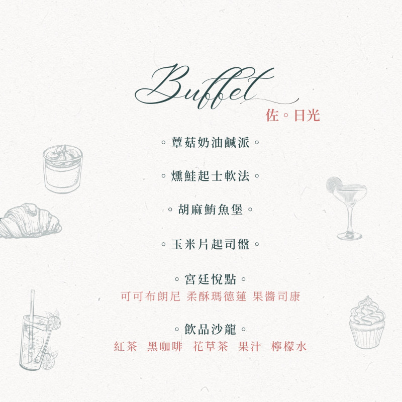 如果你想要一場不需拘謹、又充滿質感的聚會,【佐。日光Buffet】會是你的理想選擇。每位580元+10%服務費,提供豐富的輕食料理與甜點,包含精緻創意小品,搭配多款無酒精飲品,讓整場聚會自在又不失格調。