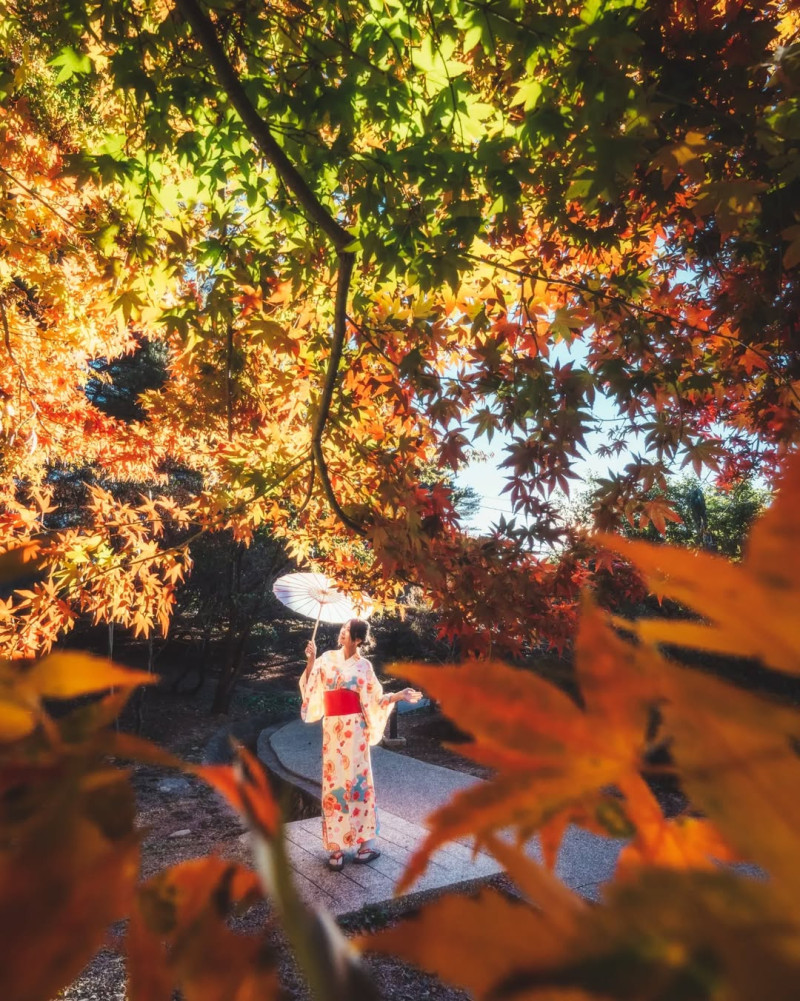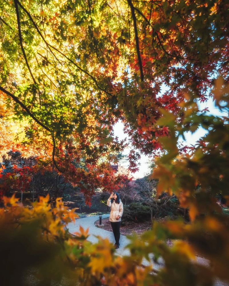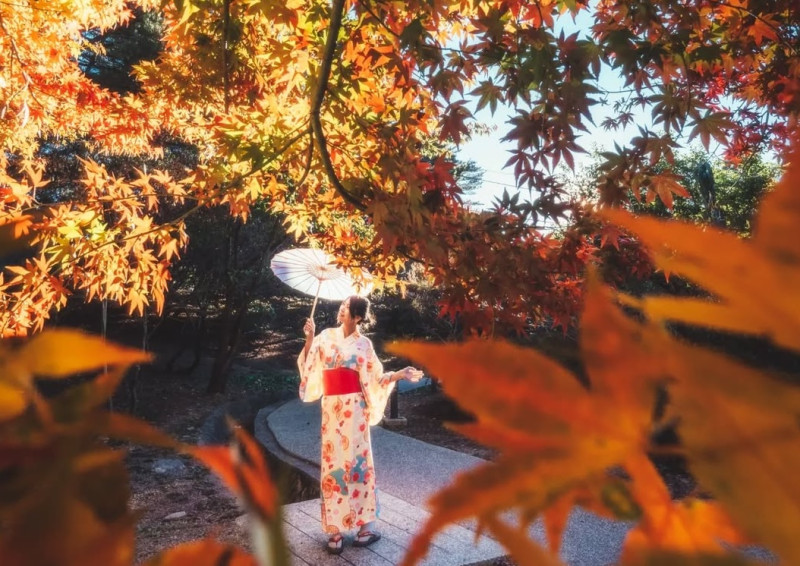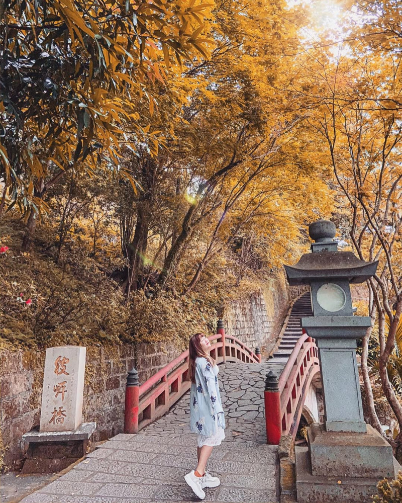 葉片呈現多層次的黃、橙、紅色彩,與古色古香的日式建築相映成趣。 另一個賞楓地點是鴛鴦湖景觀步道,結合了步道、湖泊與楓紅的美景。