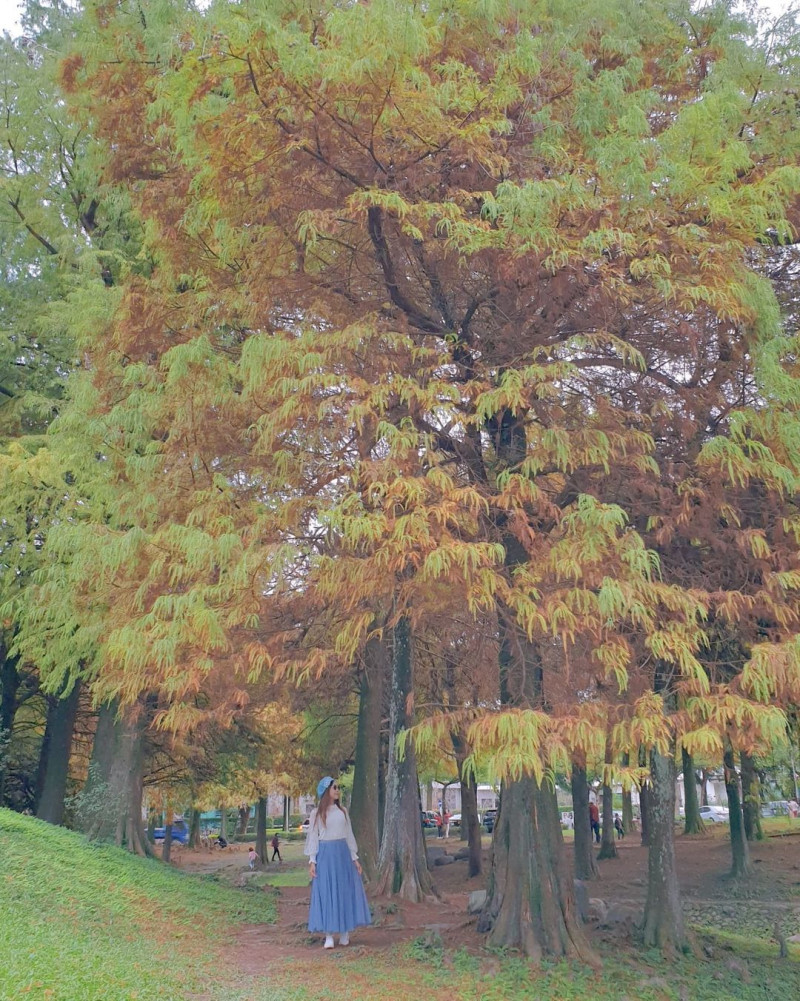 員山鄉的浪漫秘境,湖形如蛤蜊,湖畔種滿落羽松與銀杏,秋冬季轉色後映在湖面上如夢似幻。
