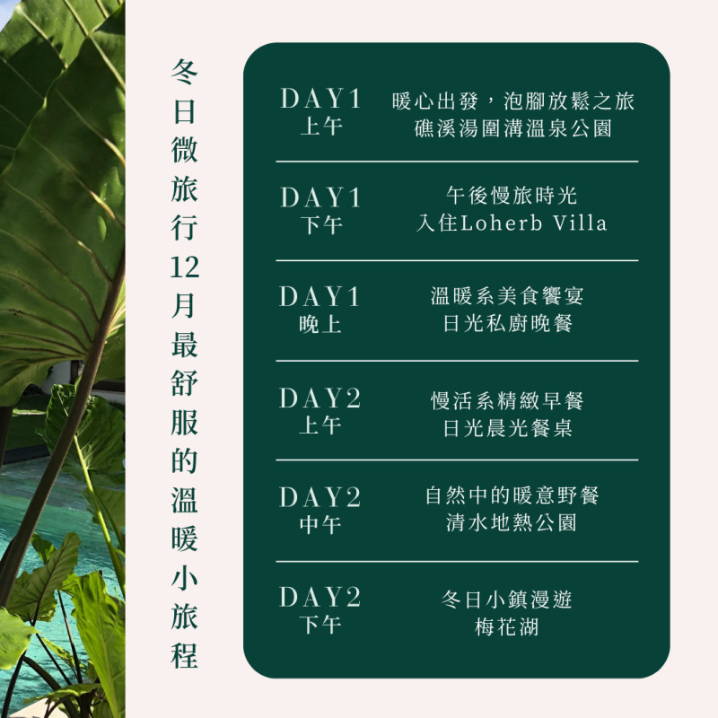 下午可前往Loherb Villa,這座結合自然與永續概念的住宿被綠意包圍,宛如森林秘境。大片落地窗灑進陽光,夜晚可靜賞星空,感受冬夜的溫柔寧靜。Loherb Villa photo by wenwen0806入住後別錯過水畔午茶時光,池畔座位能邊品甜點咖啡、邊欣賞夕陽水光,是最愜意的拍照時刻。Loherb Villa photo by wenwen0806房內設有香氛精油泡澡液,以天然香氛與溫水結合,溫潤舒緩、療癒身心,為旅程增添放鬆氣息。Loherb Villa photo by oreo_91213